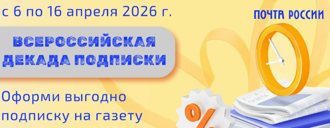 Дорогие друзья! С 6 по 16 апреля Почта России запускает традиционную акцию — Всероссийскую Декаду Подписки, в рамках которой вы можете оформить выгодную подписку на газеты и журналы.